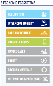 To meet these societal needs, the framework identifies 8 economic ecosystems. Four of these directly meet a specific societal need (the healthy food, built environment, intermodal mobility, and consumer goods ecosystems). Four additional economic ecosystems support the first four ecosystems in their delivery of societal needs.